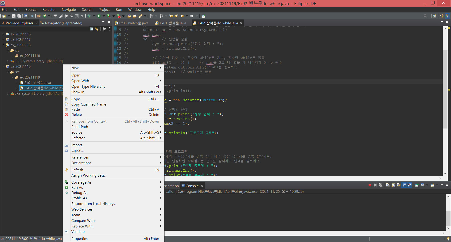 | 자바 반복문, while문과 do-while문 실습 (0) | 2021.11.27 |