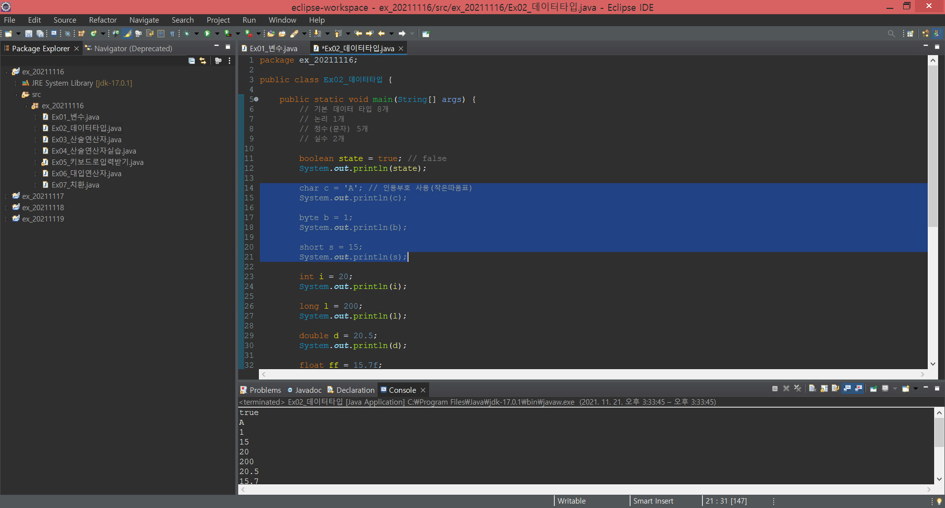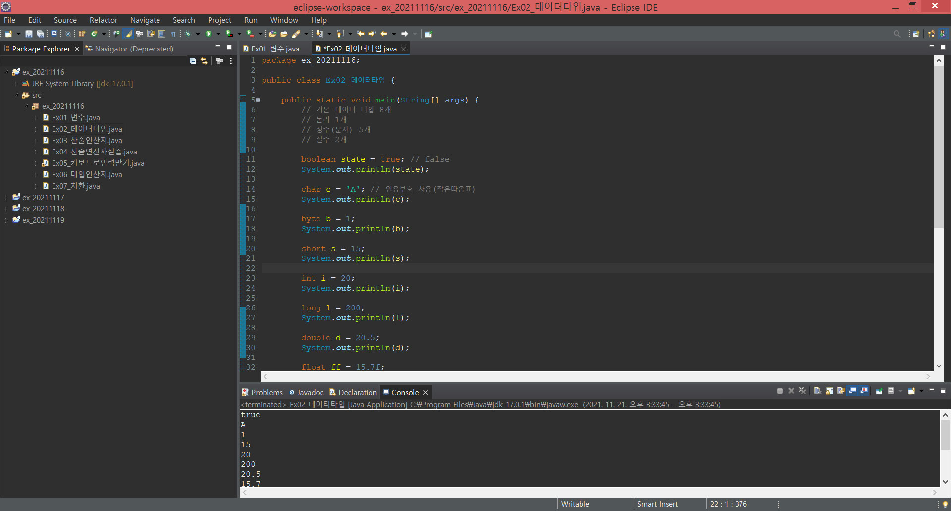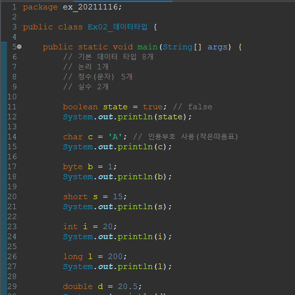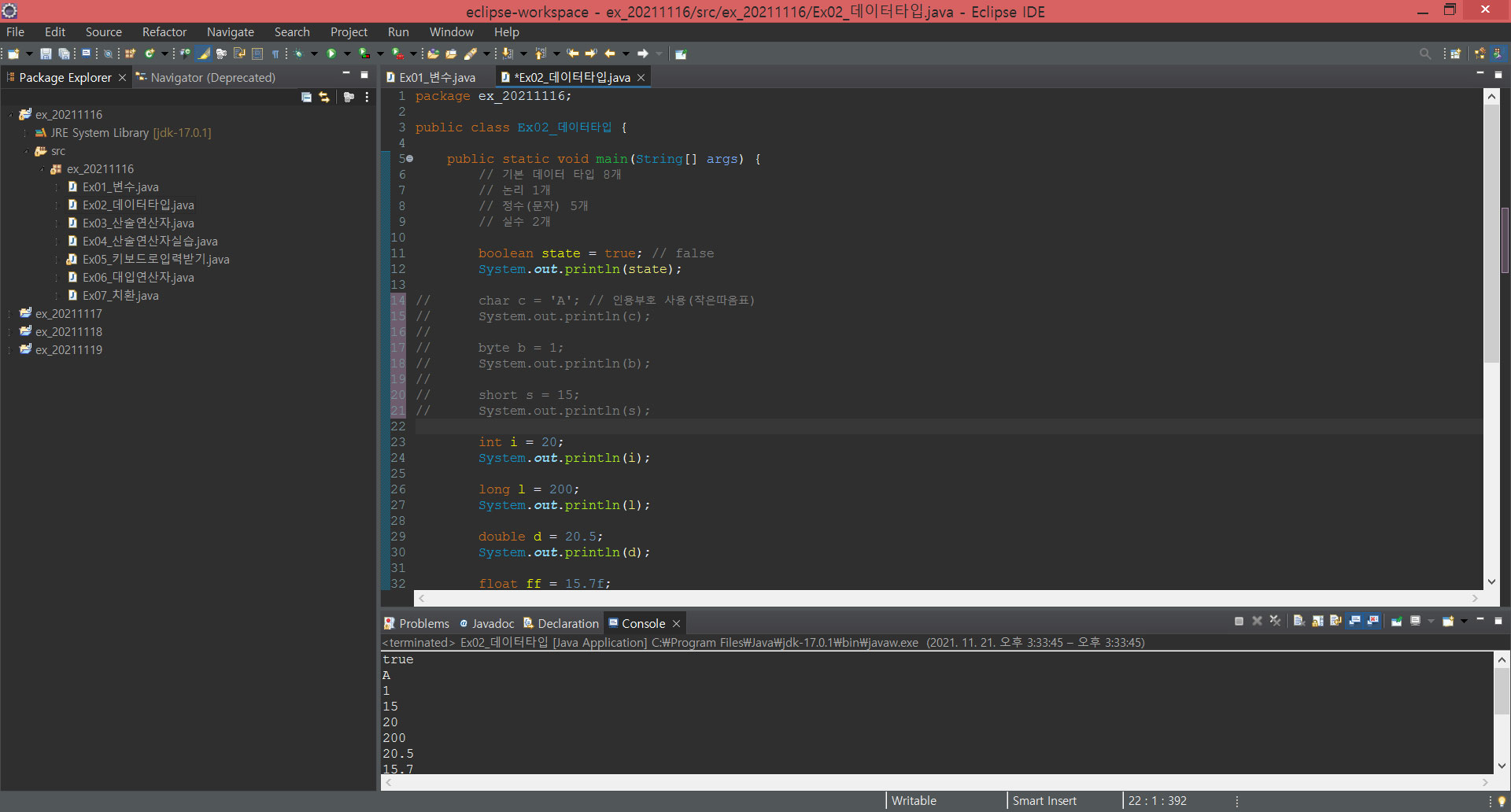 자바의 기본 데이터 타입인 boolean, char, byte, short, int, long, float, double을 코드로 짜보겠습니다. 지난 포스트 자바, 간단한 첫 코드를 짜봅시다. 이번에는 간단한 한 줄짜리 코드를 짜면서 이클립스