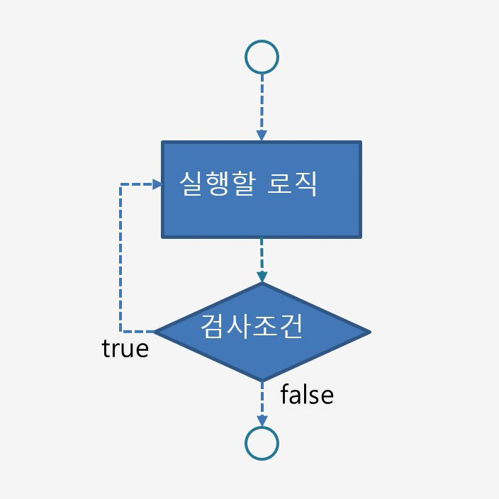그런데 while문과 다른 점은, while문은 검사 조건을 먼저 확인하고 true경우 로직을 실행했지만, do-while문은 로직이 먼저 처음에 한번 실행된 후에 검사 조건을 확인하고, true일 경우에는 계속 실행할 로직을 반복합니다.
