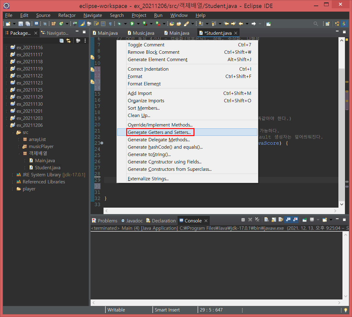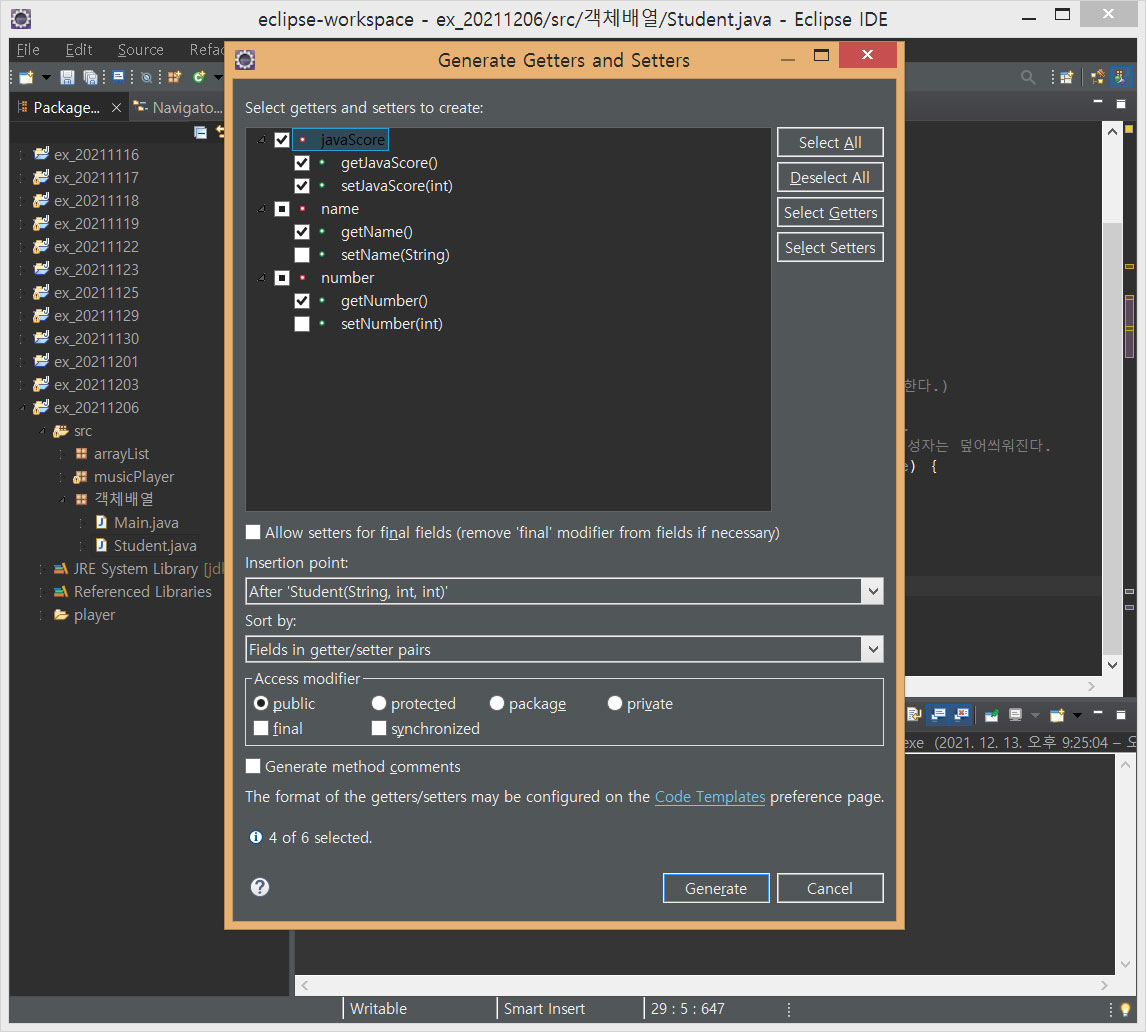 [shift + alt + s]를 누르고 이번에는 Generate Getters and Setters... 를 클릭합니다.