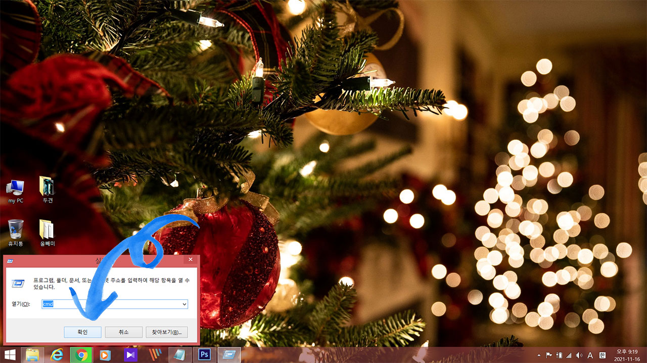 이미지처럼 실행이 뜨면 cmd를 입력하고 확인을 클릭합니다.