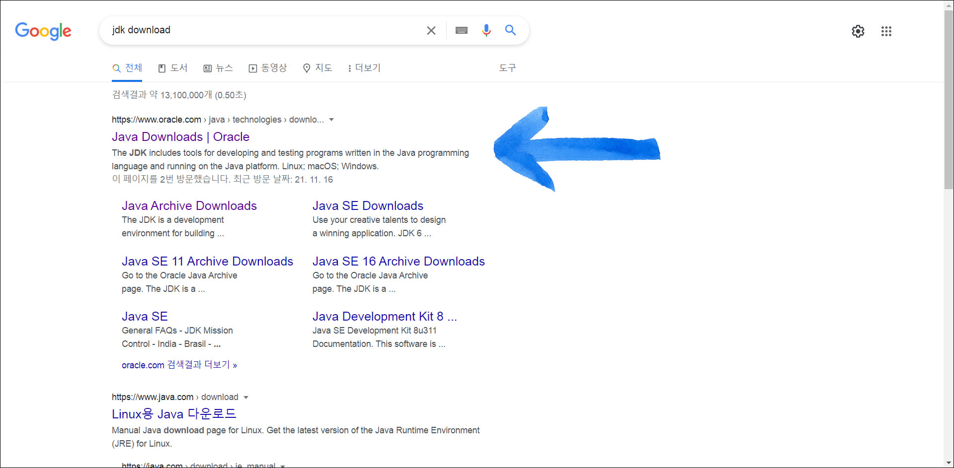 검색 결과에 보통 오라클Oracle의 홈페이지가 최상단에 뜰 텐데, 그곳을 클릭합니다.