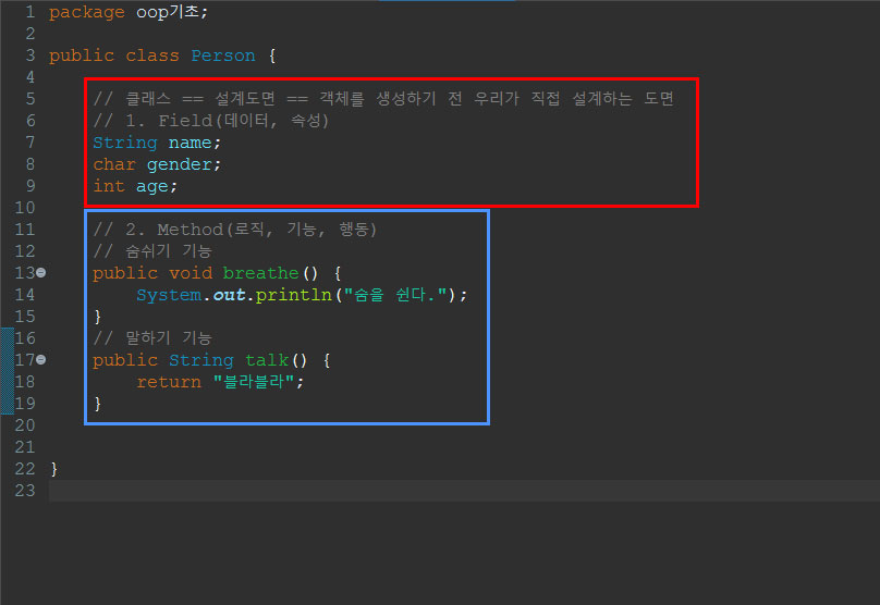 필드는 '데이터' 혹은 '속성' 이라고 말하기도 하고, 메소드는 '로직', '기능', '행동' 이라고 말하기도 합니다.