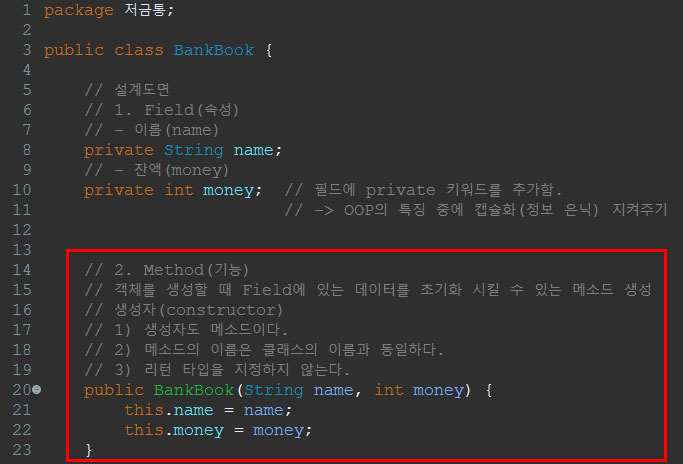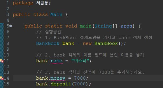 저금통이라는 패키지를 만들고 BankBook이라는 이름으로 클래스(설계 도면)를 만들었습니다.