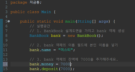 bank.deposit(7000); 은 설계 도면에 만들어놓은 돈을 입금하는 기능을 하는 메소드를 사용한 것이고,