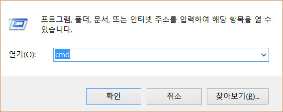 단축키 [Windows 로고 키+R]을 누르고 'cmd'를 입력하고 엔터를 칩니다.