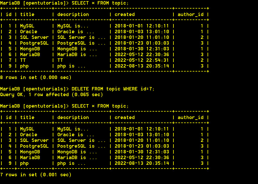UPDATE와 마찬가지로 WHERE로 id를 지정하지 않으면 모든 행들의 값이 삭제되어버리기 때문에 정말 주의해야 합니다.