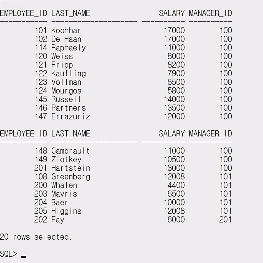 매니저 ID(사수의 사원 번호)가 100번, 101번, 201번인 사원의 사원 번호와 이름과 월 급여와 사수의 번호를 출력하는 명령어입니다.