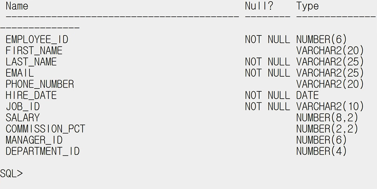 SQL> desc employees; 라는 명령어를 입력하고 엔터를 누르면 나오는 employees 테이블입니다.