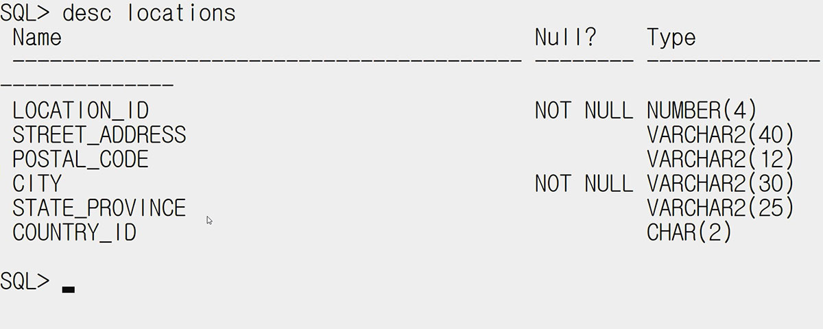 SQL> desc locations; 라는 명령어를 입력하고 엔터를 누르면 나오는 locations 테이블입니다.