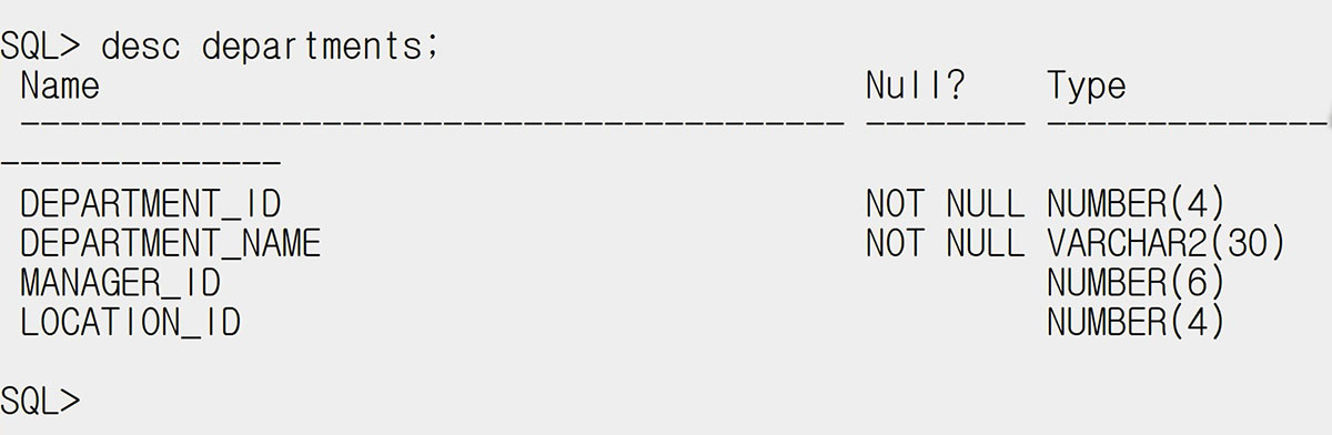 SQL> desc departments; 라는 명령어를 입력하고 엔터를 누르면 위와 같은 테이블이 나옵니다.