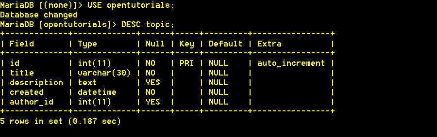 opentutorials 안의 topic 테이블은 이전에 생활코딩 MySQL 수업 때에도 자주 썼던 테이블이었습니다.