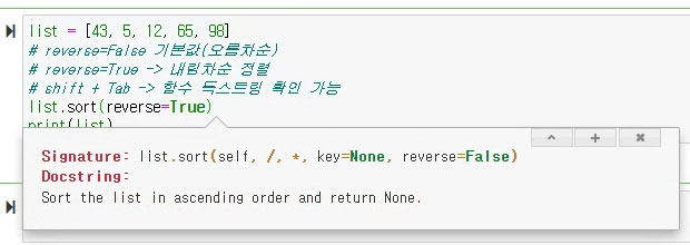 sort 함수의 괄호( ) 안에 reverse=True 라는 코드를 추가하면 내림차순으로 정렬이 가능합니다.